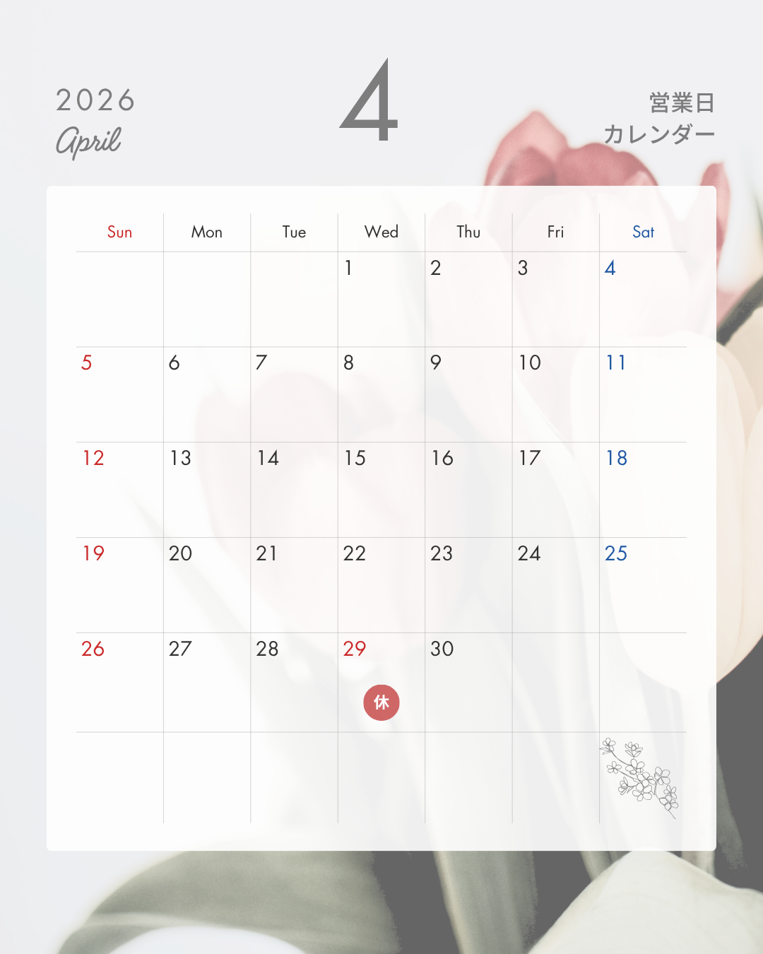 日頃より当院をご利用頂き誠にありがとうございます。 4月の休診日のお知らせになります。 4/29(金)(昭和の日) ご理解ご協力宜しくお願い致します。 -
